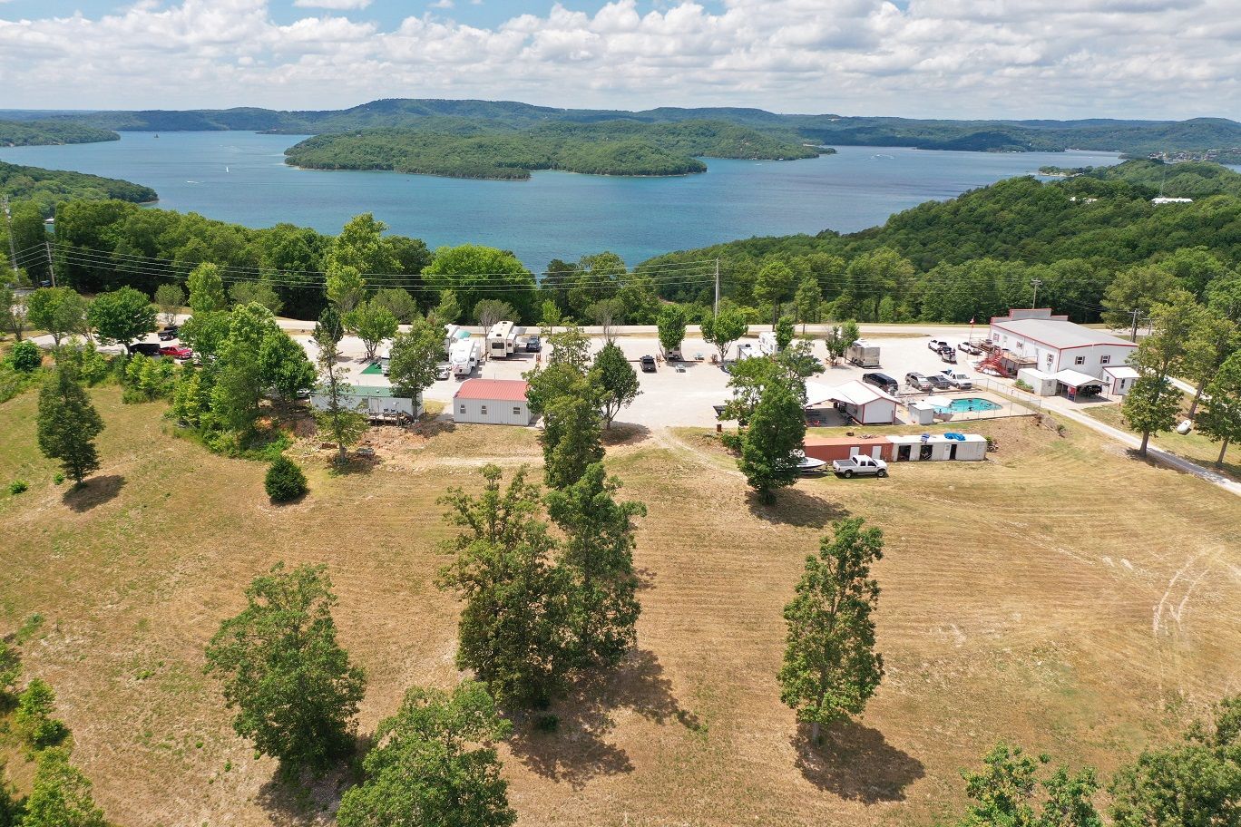 An aerial view of a parking lot with a lot of rvs parked in it.